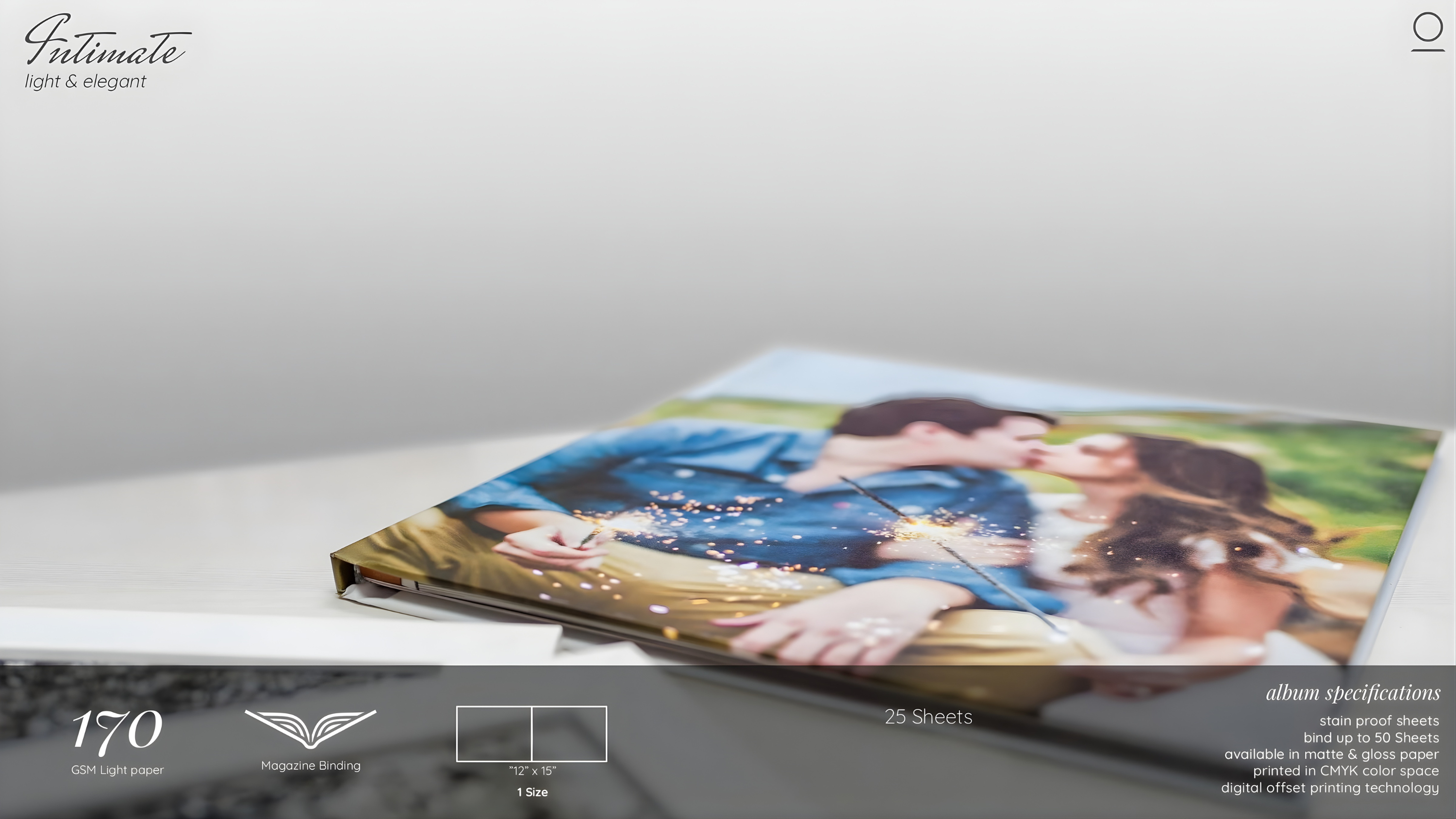Perfect for couples who prefer minimal elegance. Specifications: ● Size: 12” x 15” ● 170 GSM light paper ● 25 sheets ● Holds approximately 100–120 images ● Magazine binding ● Matte & gloss paper options ● Standard image-wrap cover ● Complimentary Buckram storage box ● Digital offset printing in CMYK color space